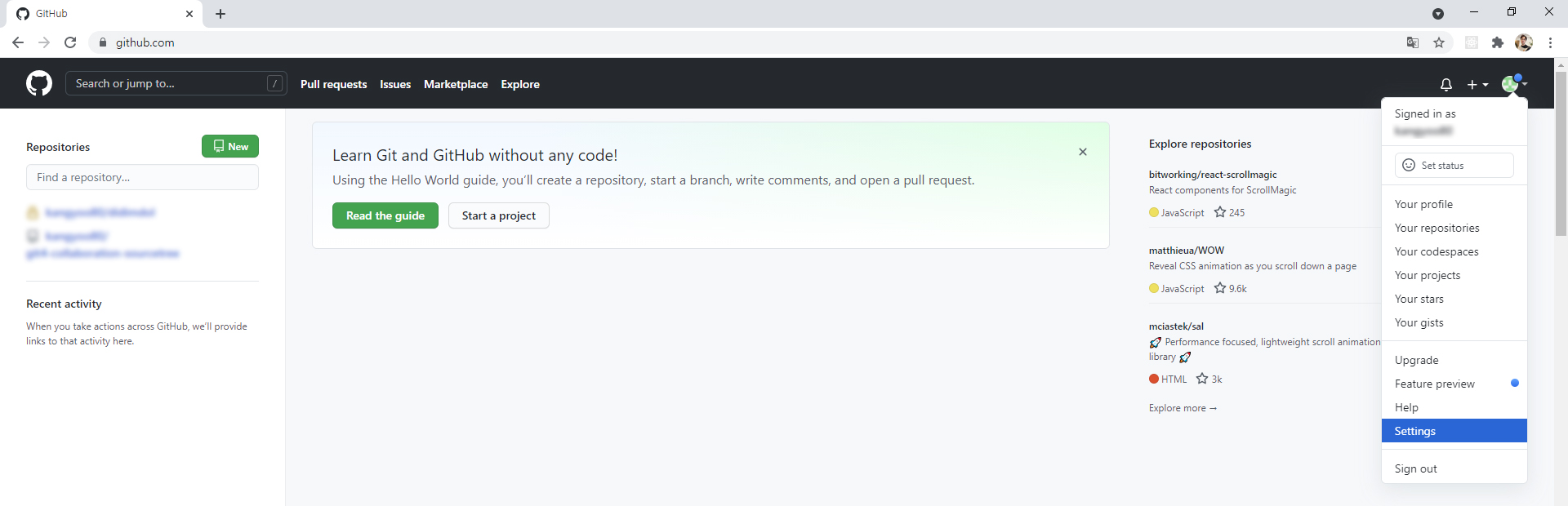 1. Github 로그인 후 상단 개인설정 클릭 → Setting 클릭