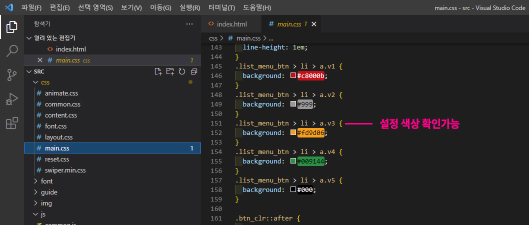 그리고 해당 CSS파일로 이동하고 싶을 경우에는 레이어 팝업창의 상단 파일 경로를 클릭하면 CSS파일 해당 위치로 이동이 가능합니다.