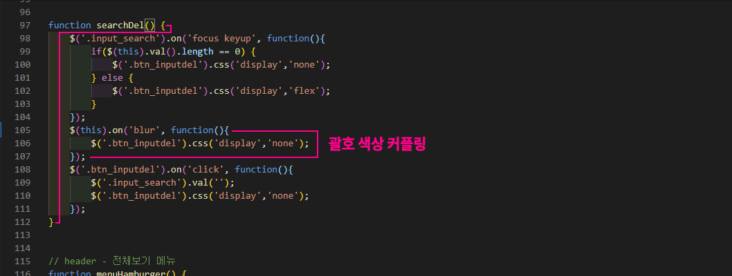 아래 이미지와 같이 커플링 되는 괄호의 색상이 동일하게 표시됨을 확인할 수 있습니다.