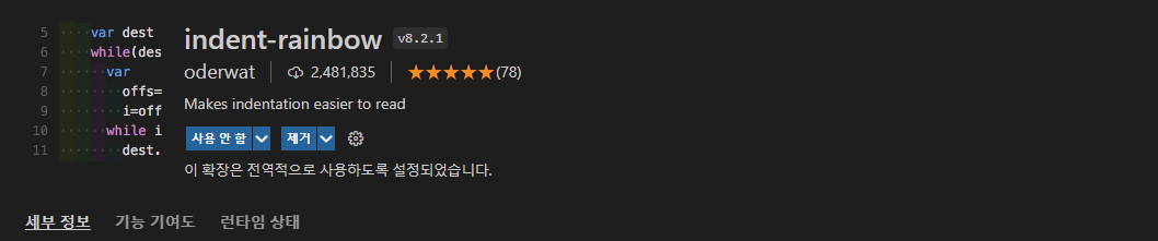 indent-rainbow 확장 플러그인을 사용하면 컬러의 구분으로 좀 더 쉽고, 빠르게 코딩 구조의 코드를 분석할 수 있습니다.