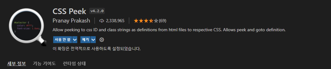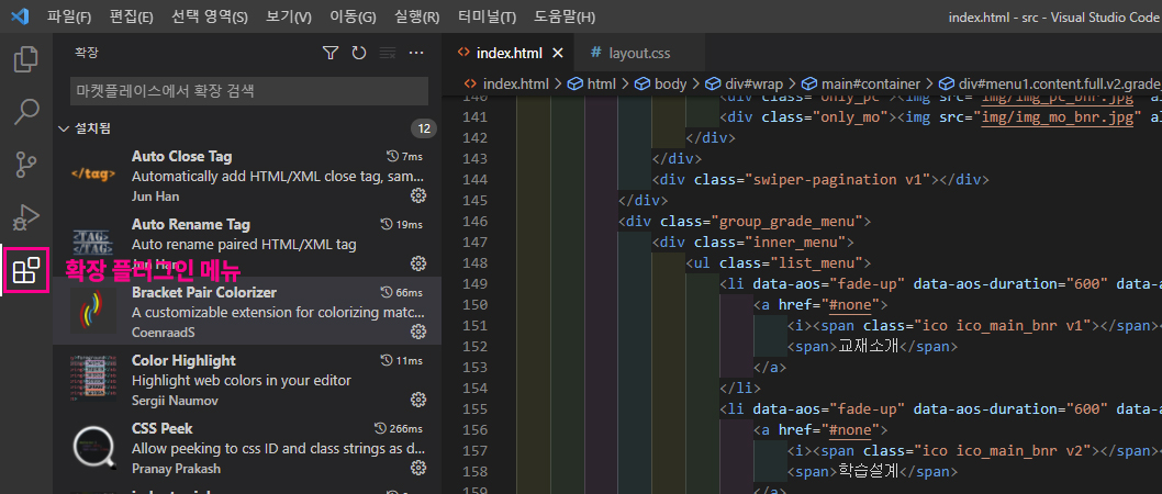 그리고 사용하고자 하는 확장 플러그인을 검색하여 설치하면 됩니다.