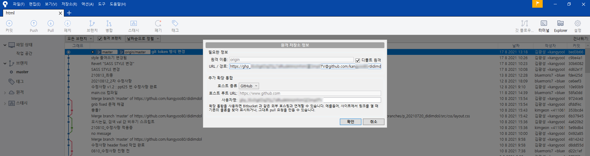 해결방법 - git 저장소에 token 등록(소스트리)
