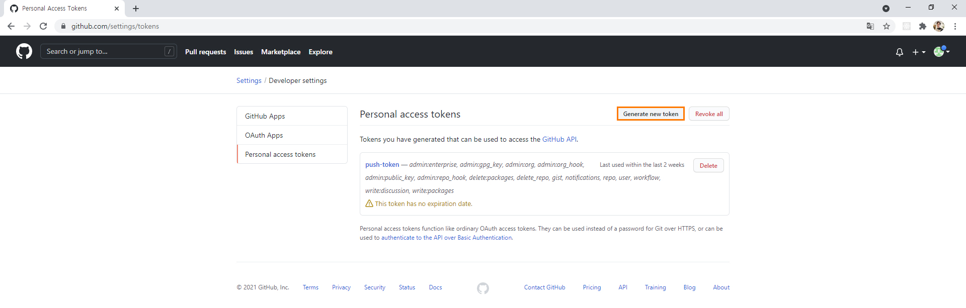 3. 본문 우측 상단  Generate new token 버튼 클릭 후 token 허용범위 설정하여 토큰 생성 완료합니다.