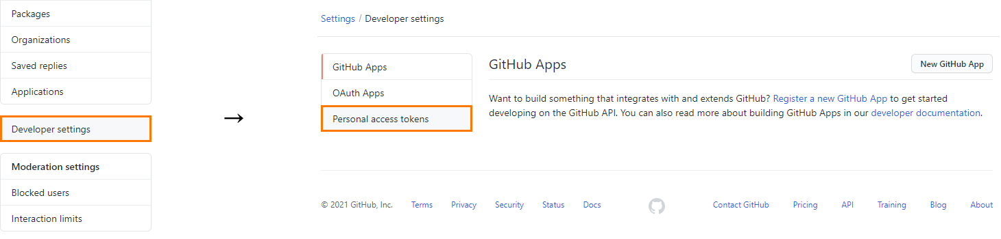 2. 좌측 메뉴 하단에  Developer settings 클릭 Personal access tokens 클릭